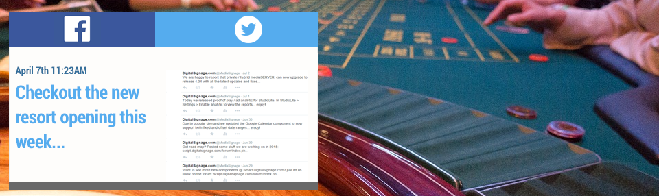 Att bygga en bra närvaro i sociala medier är en otroligt smart användning av digital skyltning för din casinomiljö. Till exempel kan du ställa in en catchy hashtag som speglar din anläggning eller låta era kunder ansluta sig via Like’s eller andra typer av sociala verktyg. Det gör det enkelt för dig att sprida din information, plus att du kommer att kunna se över och godkänna de bästa inlägg om ert företag. och allt kan styra direkt från din online-instrumentpanelen här i SignX.
